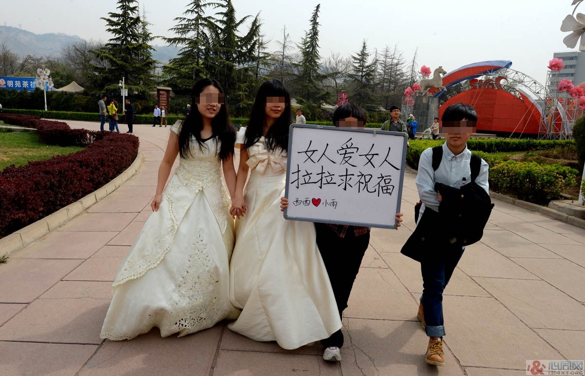 - 4月15日,甘肃兰州,两位女同性恋者在小西湖公园里举行了一场别开生面的婚礼。她们身着婚纱,举着写有女人爱女人,......