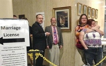 - 美国佛罗里达州1月6日起允许同性婚姻登记,两天1千多对同性恋情侣在该州合法结婚,男警察穿着正式的警服与男友一起登记......
